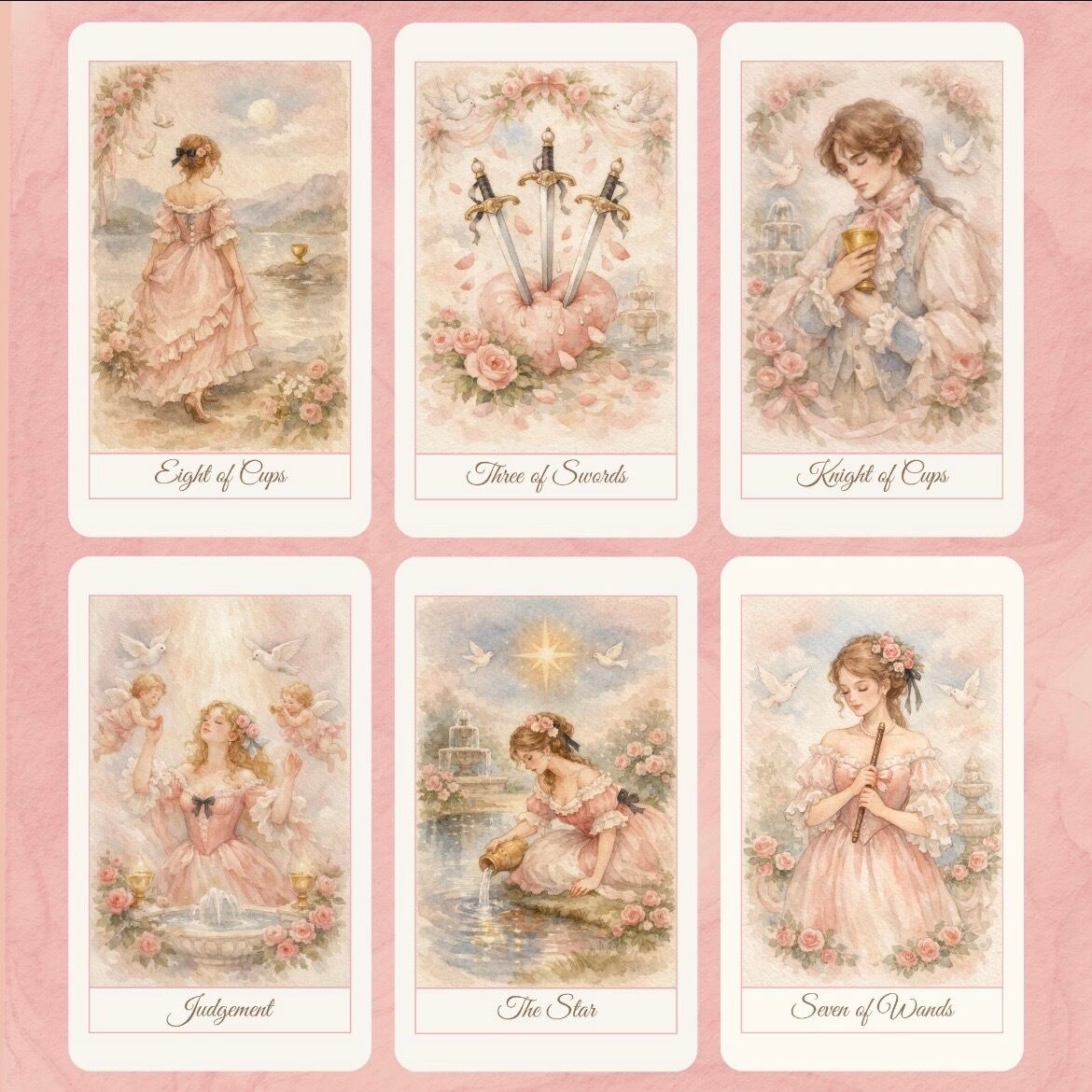 女性的なイメージ、ロマンチックなアートスタイル、そして視覚的に思慮深く一貫性のあるデッキに惹かれる読者やコレクターのために作られました。リーディングに使うにしても、ただアートワークをじっくりと楽しむにしても、パーソナルで意図的な感覚を感じていただければ幸いです。